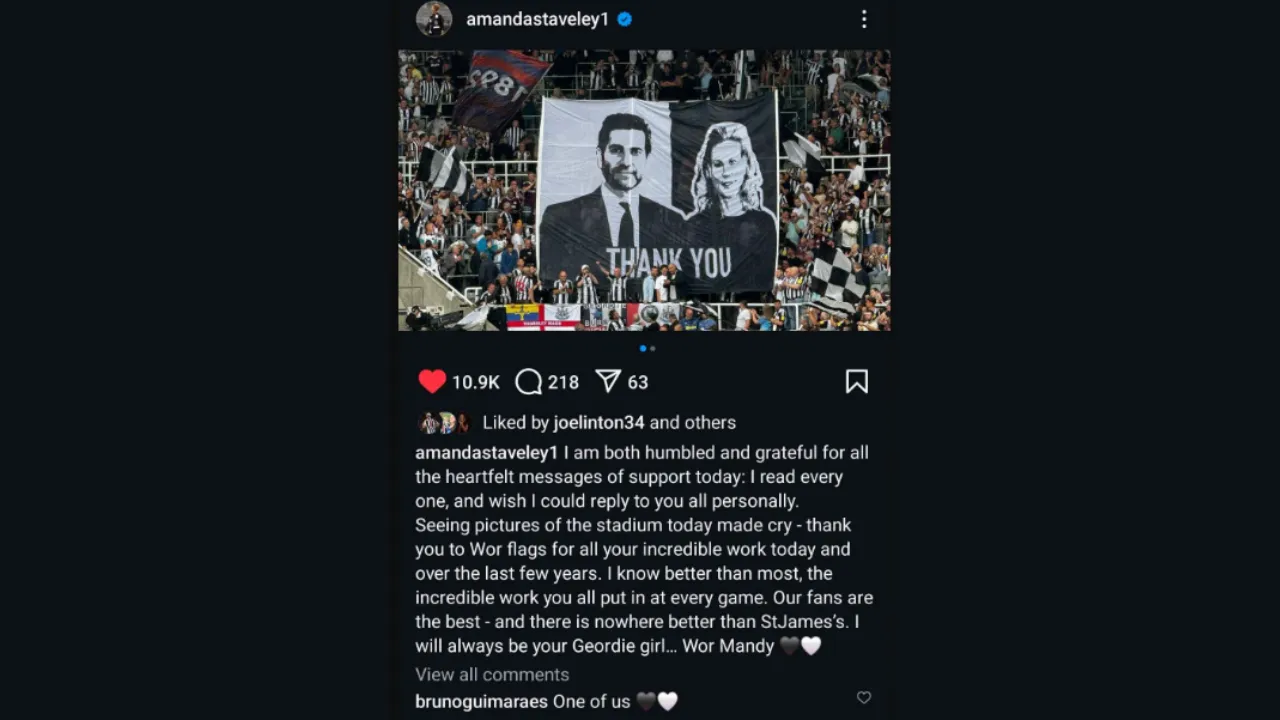 This morning Amanda Staveley took to Instagram to wish the side good luck in their season opener, and then shortly before kick-off in the game against Southampton, Staveley was back on social media to leave a touching message for the fans.
